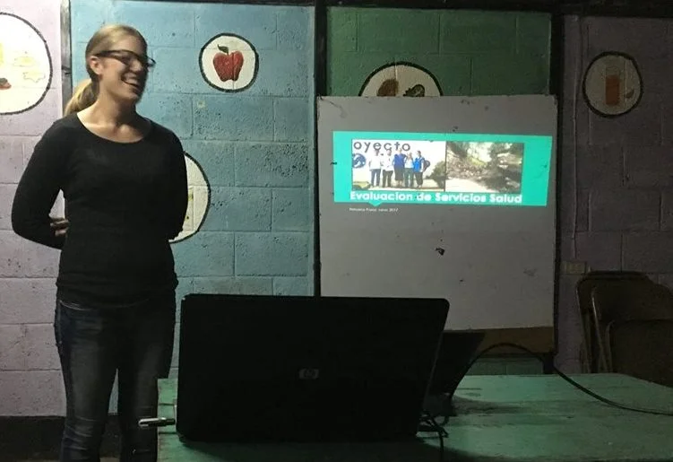 Volunteer Arielle presents the findings of her healthcare services assessment to Primeros Pasos staff.